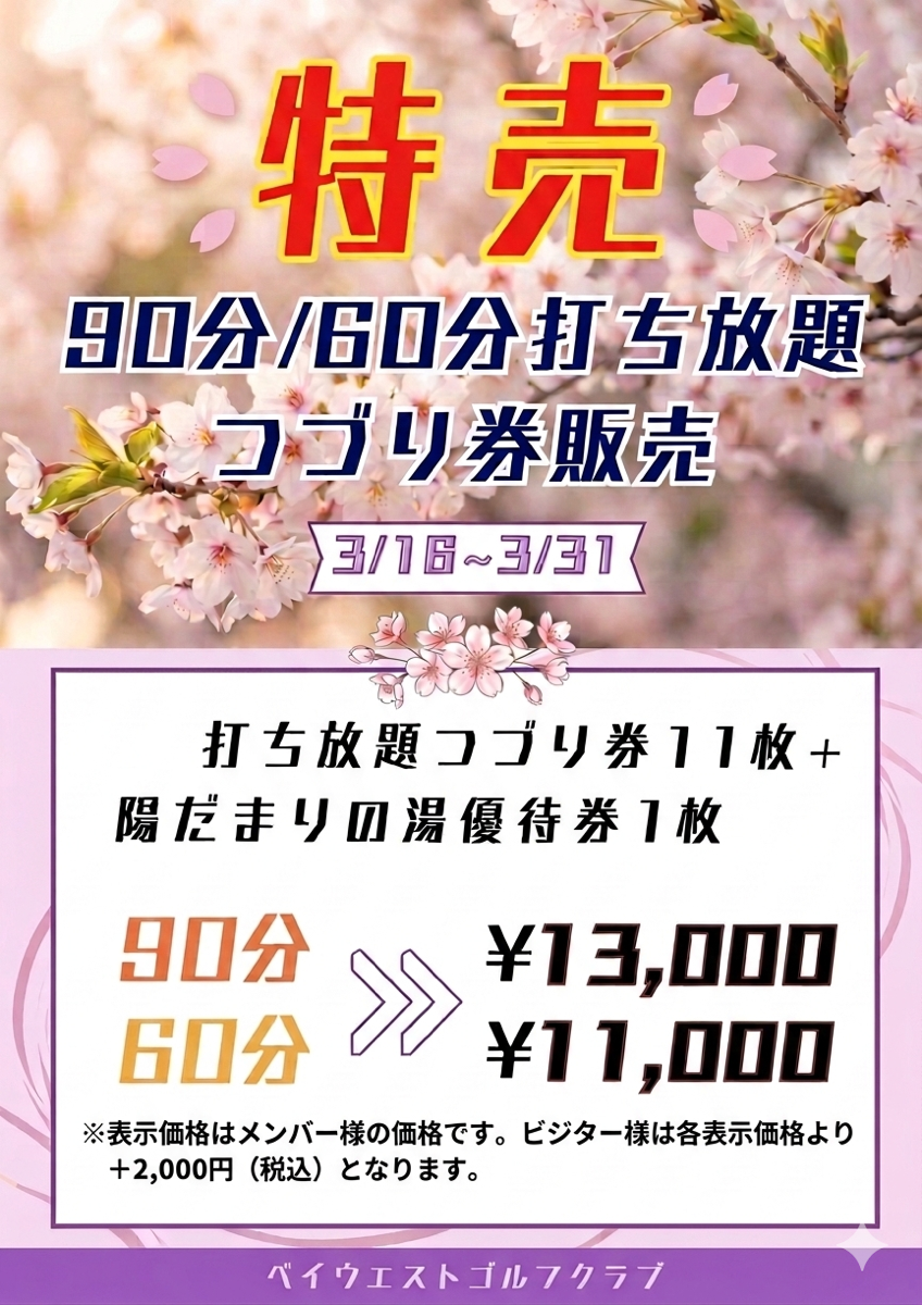 10回分の値段で11回打ち放題ができる+陽だまりの湯優待券が1枚付いてくるお得なキャンペーンです😄